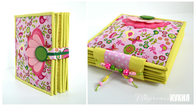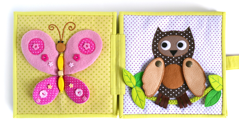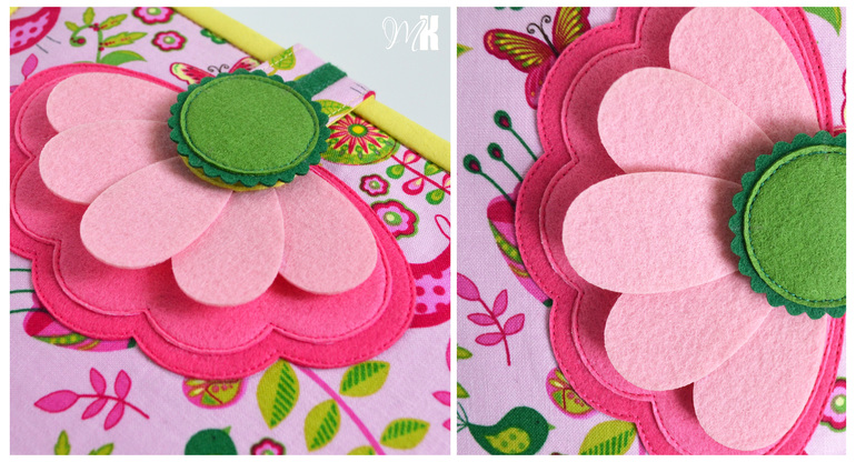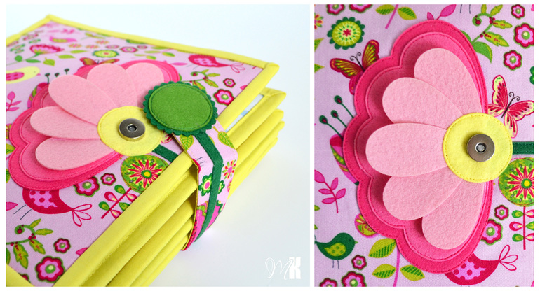 На обложке - объемный цветок - застежка. Учимся расстегивать-застегивать магнитную кнопку.