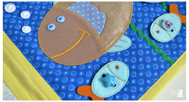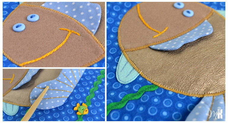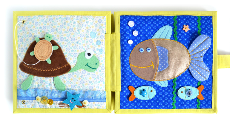 У черепашки панцирь из натуральной кожи, лапки - объемные, поднимаются. Еще малыш найдет здесь маленькую черепашку из натуральной кожи и морскую звездочку из фетра.