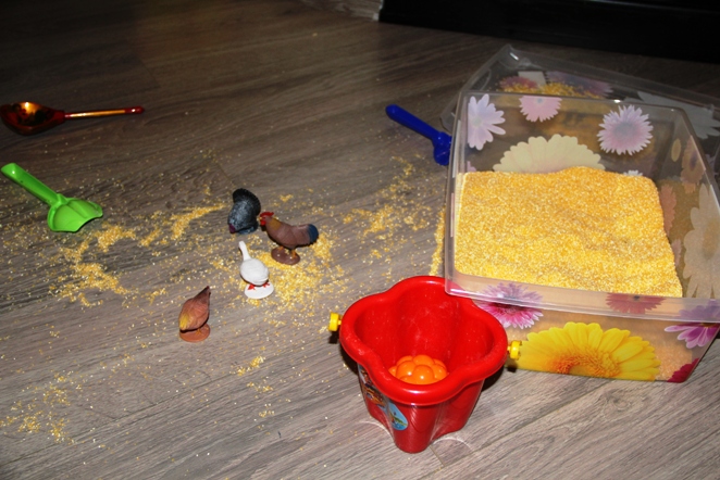 ну, и тоскуем по песочку: ) в стране скоро будет голод, а мы кукурузной крупой играем:) гречку даже побоялась брать - убили бы точно: )) а потом крупой можно и курочек покормить ( отрабатываем движение двумя или тремя пальчиками, когда берем щепотку крупы и сыплем курочкам).