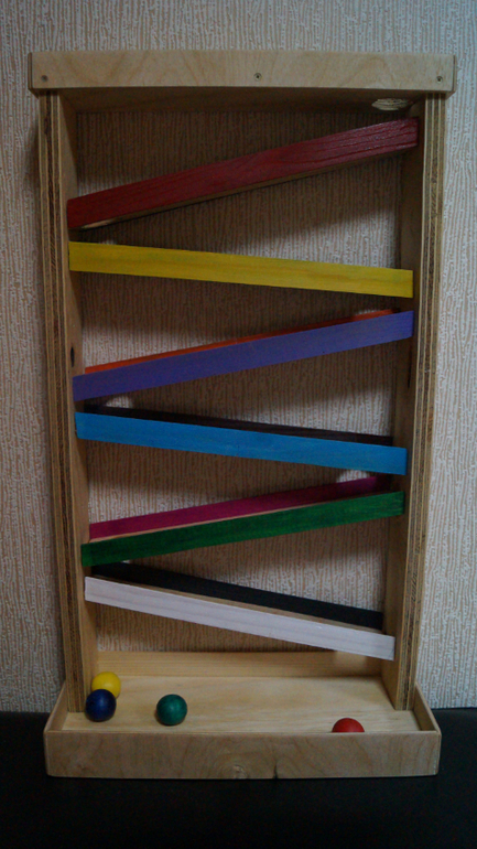 Материал для развития моторики и координации движений, стимуляции подтягивания и вставания на ноги с опорой, а также - для развития зрения и головного мозга. Ребёнок должен встать на ножки, чтобы опустить шарик в отверстие наверху, затем опуститься, чтобы достать скатившийся шарик. Интерес к движению шарика стимулирует упражнение в подтягивании и вставании с опорой. Слежение за движущимся шариком тренирует зрительные мышцы, пересечение взглядом средней линии тела способствует взаимодействию полушарий мозга.