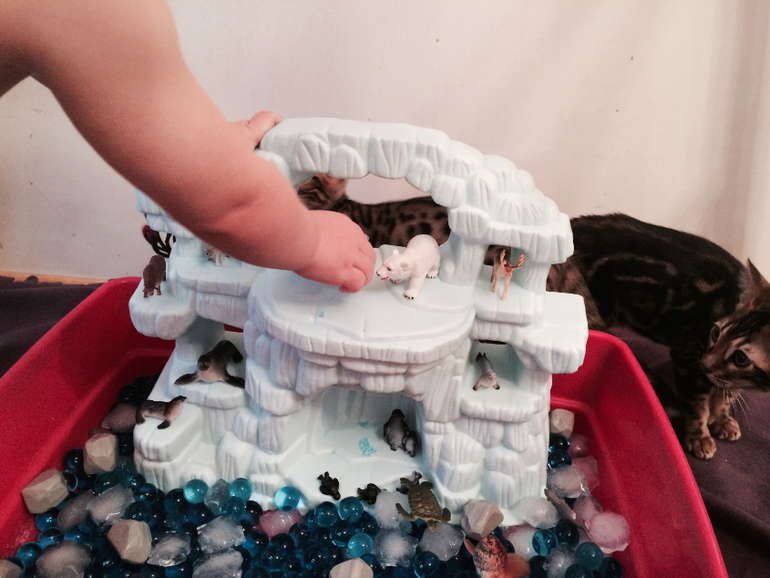 На днях в магазине игрушек недалеко от дома нашелся некий набор фиг знает какой формы из кучи арктических животных и льдины. И вот сегодня Котя получил свою личную маленькуа арктику в розовом контейнере.