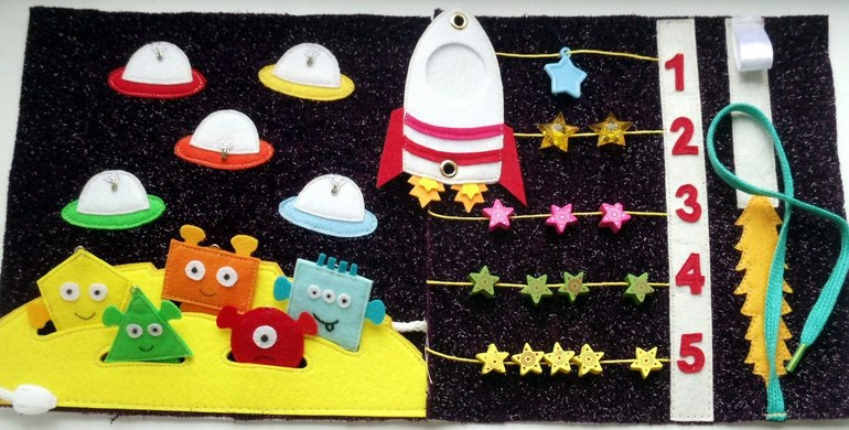 Собраны все основные развивающие элементы - кнопочки, липучки, молния, пуговки, завязочки на бантик, игра лабиринт, пальчиковая бабочка, перетяжки, ролевые игры -можно полетать на ракете