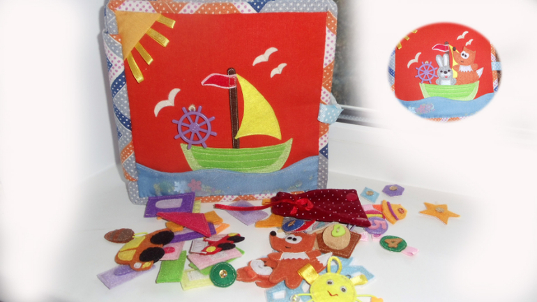 Дошила развивающую книжку. Как всегда различные застежки- кнопки, пуговки, фастекс, учимся считать до 5, изучаем цвета радуги и геометрические формы, перетяжки, лабиринт и так далее. В-общем все для развития малыша