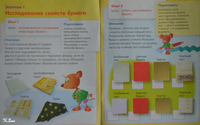Занятие № 1 "Исследование основных свойств бумаги " состоит из 5 простых опытов: "познакомиться с основными свойствами бумаги"; "узнать, как сгибается бумага", "исследовать звук, который издает бумага при сминании", "проверить, сколько места занимает бумага в пространстве", "выяснить, какие пишущие инструменты (карандаш, кисточка) взаимодействуют с бумагой".