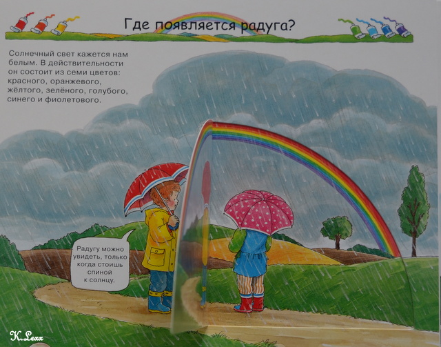 Книга очень красочная, большого формата, с множеством окошечек (которые Андрюша обожает находить и открывать). По возрасту, подходит для дошкольников (примерно от 4 лет). Что-то из этой книги, еще для Андрюши рано, но некоторые разделы можно вместе читать, рассматривать картинки и использовать для собственных исследований (радугу, ветер и дождь можно спокойно изучать).