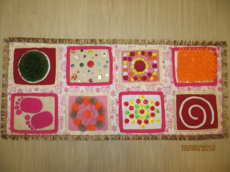 Материалы, из которых выполнены кусочки различны по своим тактильным свойствам. Здесь есть и пушистые помпоны, немного колючая искусственная травка (но только немного),зернистые флисовые шарики, наполненные горохом, среди которых спрятана пищалка, гладкие камушки, пуговички и другое. Коврик выполнен в ярких цветах,которые привлекут внимание малыша.