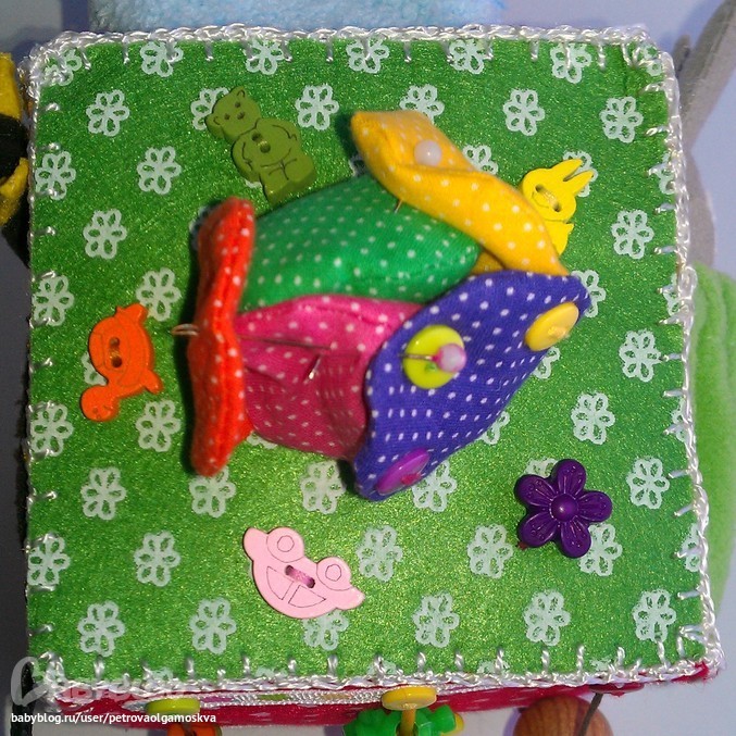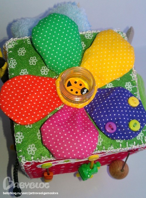 2. Не менее избитый классический сюжет - цветок, с напичканными чем-нибудь полезным лепестками. В моем цветке буйство красок взяло верх над фактурой (лепестки обычно делают из разных тканей), но постаралась с ощущениями - лепестки: шуршит, мягкий, с гранулятом, с одной большой бусиной, с пуговицами на поверхности. Цветок с секретом - серединка представляет собой вшитое горлышко с настоящей закручивающейся пробкой, внутри все те же)))) - я про божьих коровок. Но и этого было мало - без дидактизма не обошлось - показываем цвета: под каждым лепестком пуговица забавная в тон лепестку.