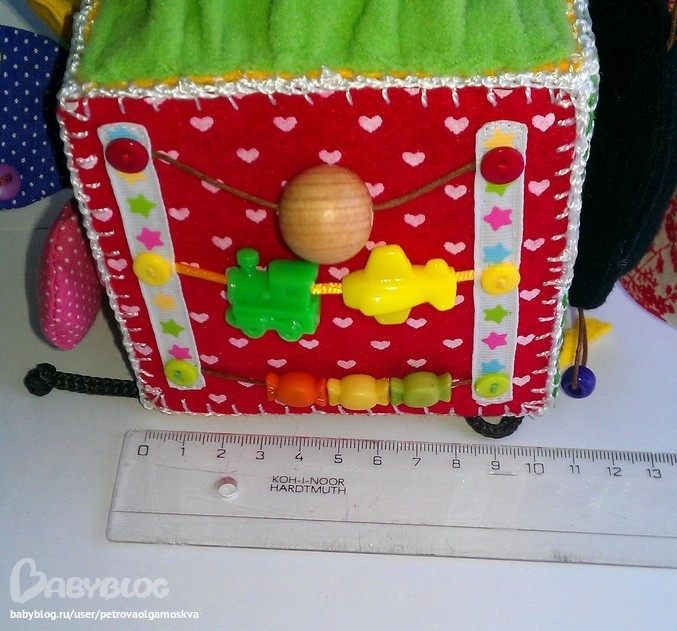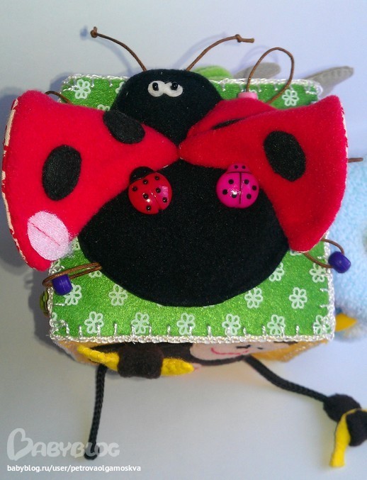 1. Божья коровка - настолько примелькавшийся персонаж в рубрике развивающих игрушек, что уже в глазах рябит, а детя нравится... очень. Особенно если у неедвигаются и шуршат крылья (нашла супершуршалку - пакет для запекания в рулонах), есть лапы с бусинами, усы, пассажиры на спине (ненавязчиво объясняем понятия "большой-маленький"), а сама она на магнитной кнопке, и если сил не хватит отсоединить о кубика, то точно хватит, чтобы покрутить ее. Брюхо из жесткого фетра, спина из флиса, для объема внутри наполнитель.