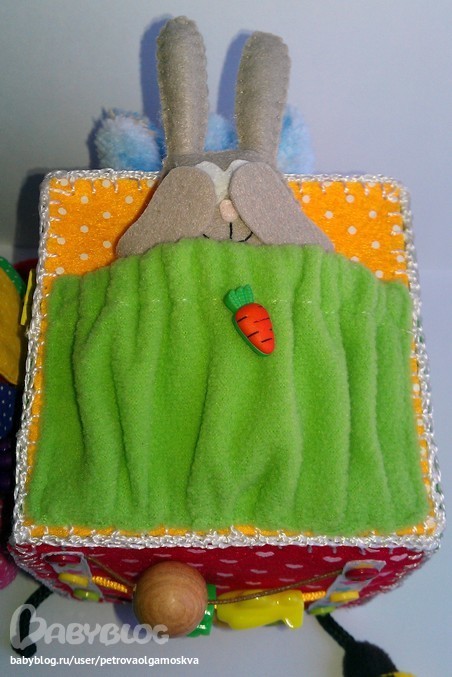 Кубик не большой - 10х10, сюжеты классические, то есть любимые и проверенные детишками. Грани сделала из цветного фетра, укрепила клеевым дублерином, внутри куб из губок с вшитыми шумелками.