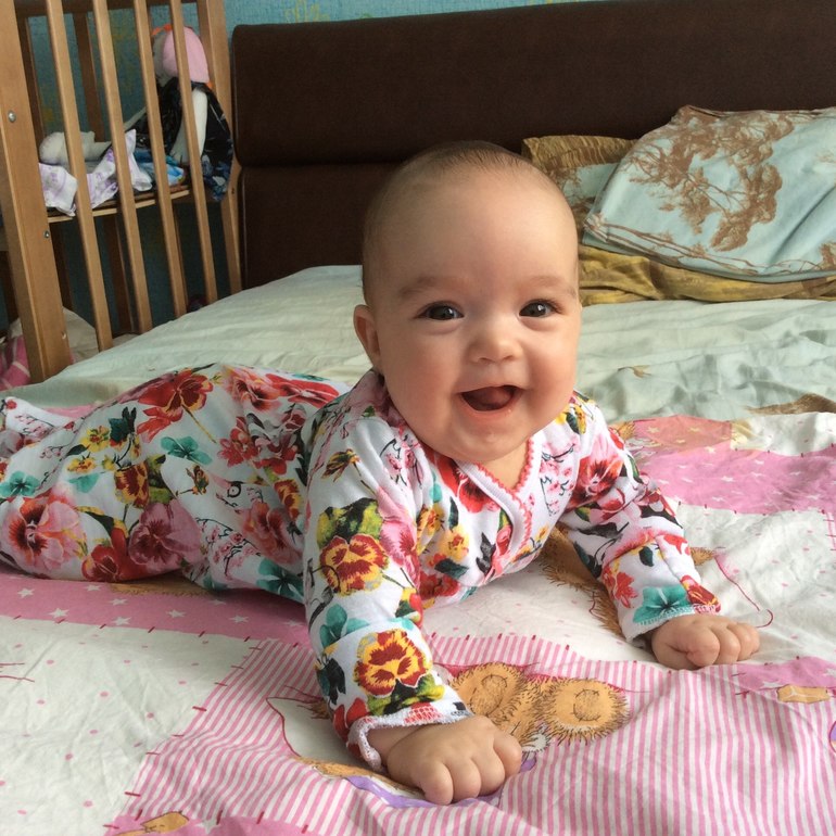 3 месяца 22 дня: перевернулась со спины на живот! Самостоятельно без помощи и вытащила ручку. Теперь переворачивается туда сюда постоянно. Но так как любит только на животе, в основном, перевернется и начинает все разглядывать. Ползает назад смешно :))) Ее оставишь, прихожу - а она совсем на другом конце коврика. Оставляю ее только на полу - купила коврик-пазлы, удобно очень. Твердо, что удобно переворачиваться-ползать, но мягко головой биться. Только вот по площади он маловат. Думаю, чем застилать комнату, когда ползать начнет и надо ли вообще этим заморачиваться, может, и на полу нормально?)