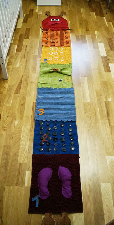 На фиолетовом квадрате мешочки-следы наполнила гречей и макаронами. Потом можно будет угадывать где что прячется. На синий квадрат пришила старые пуговицы, предварительно хорошо их промыв. Очень важно пришить прочно, Ярослав каждый раз старается их оторвать. На голубой квадрат нашила голубые полосочки и внутрь положила карандаши. Хотела просто веточки. Набрала их, помыла, вставила, но оказалось, что сучки очень колкие. Всё пришлось переделать. На зеленый пришила «волшебный» кармашек, туда можно чего-нибудь прятать и радостно доставать. Ещё яркая пряжка, которая ездит туда-сюда, если постараться и тренажёр для застёгивания-расстегивания пуговицы. Жёлтый квадратик получился массажным, благодаря колечкам от шторки в ванну. На оранжевый пришила геометрические фигуры, сделала прорези и продела шнурки. Ну а красный - голова гусенички. Она может улыбаться шиииироко-широко (молния открывается) или очень скромно (молния закрывается).