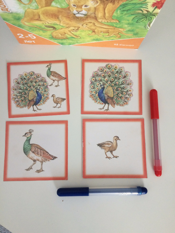 С оборотной стороны карточки подписаны, лично я только отсюда узнала, что самка павлина - пава, а не павлиниха.