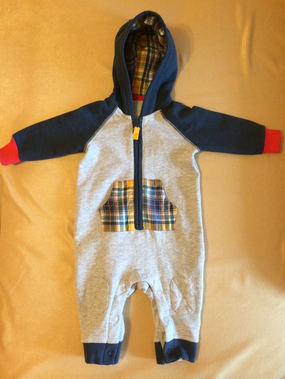 2. Комбинезон mothercare с капюшоном серо-синий с карманом, р. 0-3 мес., материал с начесом на внутренней стороне, постиран и примерян, 600 руб.
