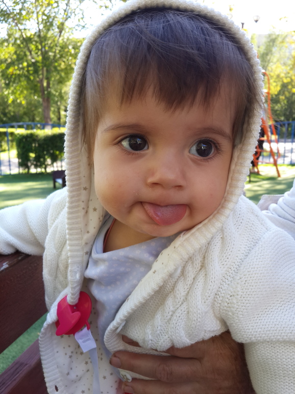 В общем за месяц отрастили 4 зуба, каждый понедельник был новый зуб) теперь их 8. Орудует ими замечательно) иногда жутко скрипит... сразу даю соску иначе не прекращает. Стала стоять не держась по секунд 10-20. ползает быстро, стоит и все достает) из всех шкафов) начала говорить мама) знает где папа где Пуся)