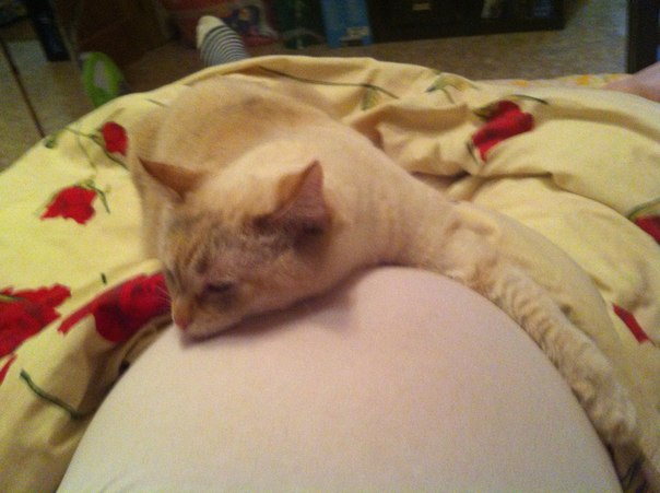 Как здорово лежит! :))А я мамину кошку боюсь пускать, она такая слониха, еще малыша задавит, хотя просится на пузико иногда