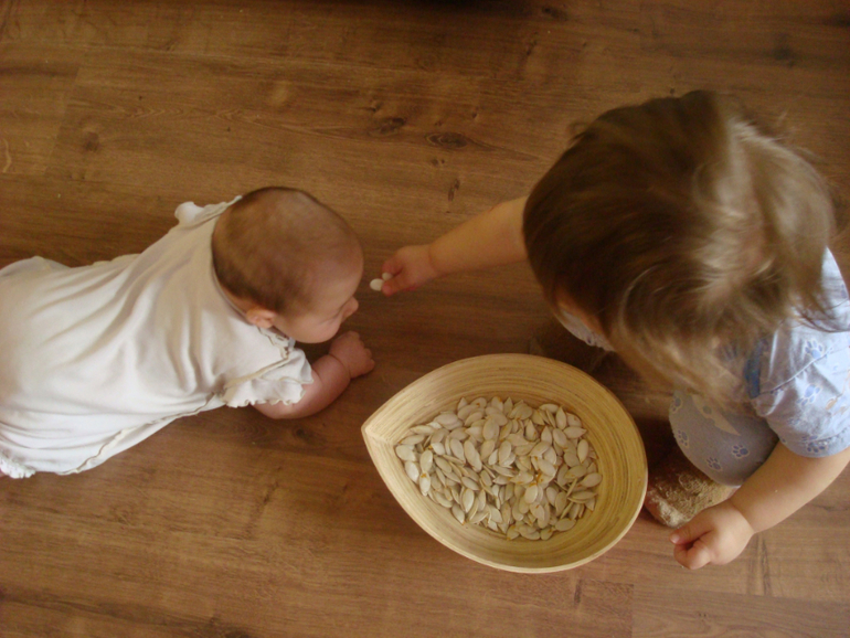 Тыквенные семечки как натуральный материал для развития мелкой моторики (в том числе маминой - при уборке) и, как выяснилось, коммуникативных навыков :0)