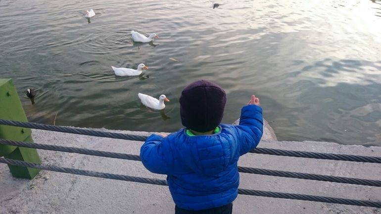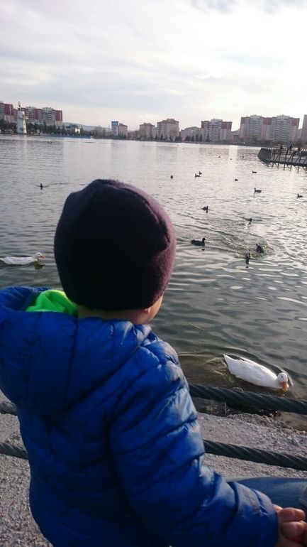 Кто-бы знал что будет кормить. Ездили, просто катались по парку,обычно я кормила а сын наблюдал,а а тут на те, и уже сам кормит уточек. Хорош пример-заразителен. :-)
