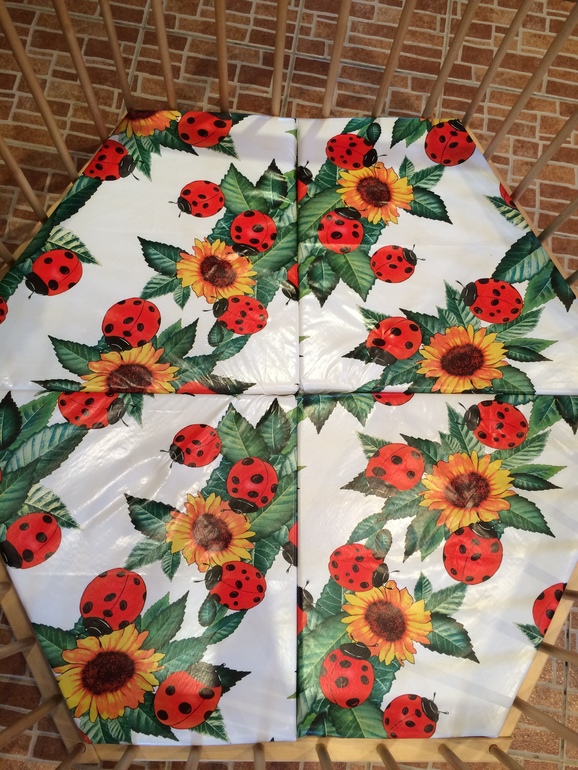 Дно у манежа состоит из 4-х частей, соединённых между собой. Сверху дно обито клеёнкой с мягкой подкладкой, что очень удобно!!!
