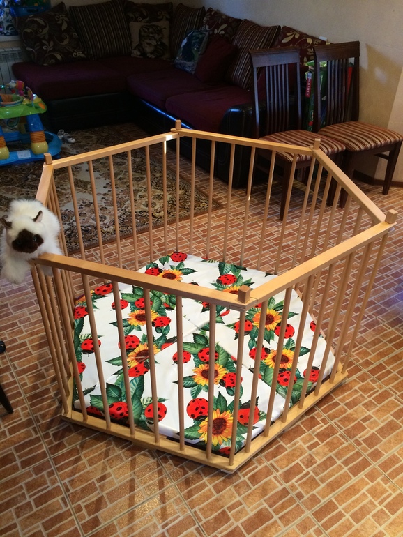Манеж просторный, имеет 6-ти угольную конструкцию, благодаря чему полезная площадь у него больше, чем у прямоугольного манежа.