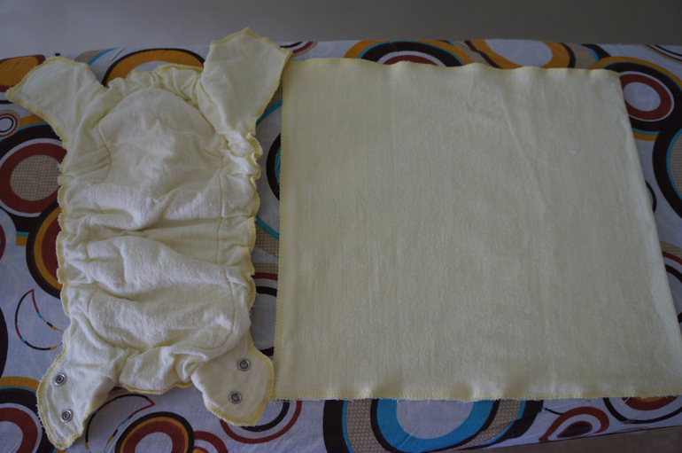 8. Примерила в подгузник "пиратский" вкладыш. Показался немного длинноват и толстоват. Поэтому из 2 слоев фланели сшила почти квадрат 30х33. При тройном сложении выходит 6 слоев. С учетом всех слоев ткани подгузника и вкладыша получается 10 (слой бязи не в счет).