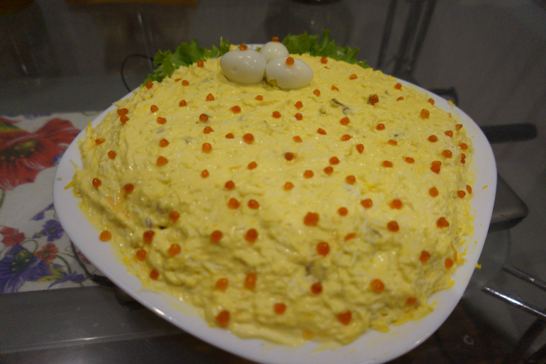 Для приготовления понадобятся: Красная рыба,плавленный сыр с грибами,1 банка маринованных грибов "Ассорти",2 пера зелёного лука, 4 яйца,майонез.