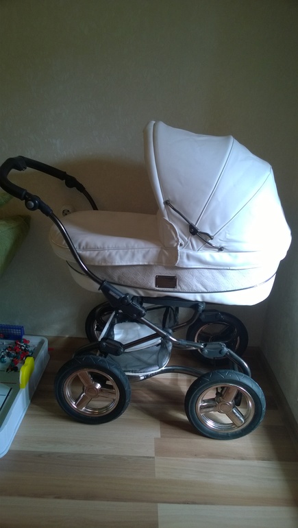 коляской осталась очень довольна.Откатала всю зиму - настоящий танк.Блокировка колёс удачная - поднятием лапки вверх(ногой),не нужно наклоняться.Прекрасная амортизация.Даже на даче по грунтовке и в снег - коляску не трясло и ехала идеально.Огромная люлька.Малыш в комбинезоне + меховой конверт помещался спокойно.Материал эко-кожа.какие-то капли-легко протирались тряпочкой.В комплекте дождевик+москитная сетка.Из проблемок :потёртость на ручке,но можно при желании купить накладочки(лично мне никак не мешало это)Из автоматического складывания,коляска получилась полуавтомат- с одной стороны штучка для сложения сама не отъезжает и ее в ручную отодвигаю.Сложностей каких-то в этом нет.Дело привычки.На другой стороне -штучка для сложения сама отъезжает.Остальные характеристики данной модели можно почитать в интернете.Цена 7000р.Торг разумный.