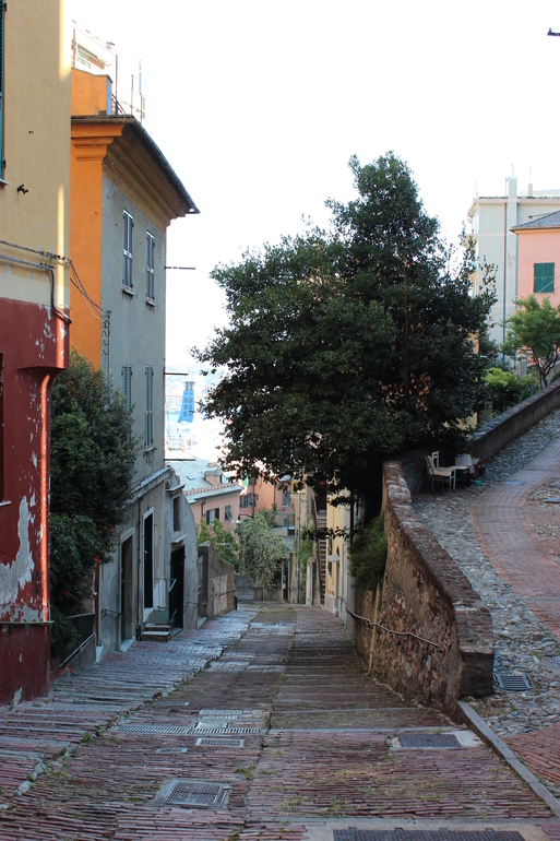 Ах, да, забыла написать про наше жилье в Генуе! Лучше, конечно, селиться в центре у порта или в старом городе, хотя многие пишут, что там шумно. Мы снимали квартиру в тихом районе, где нет туристов, а живут итальянские бабули. Квартира оказалась высоко-высоко по пешеходной улице-лестнице, вымощенной кирпичиками, куда не проедет ни машина, ни чемодан на колесиках. Как туда взбираются эти самые бабули остается для меня загадкой! А они взбираются, да еще и в туфельках!!! Вот она, эта самая улочка: