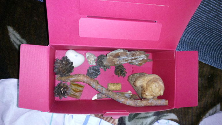 сенсорная коробочка "Мишка косолапый" играем с 5 месяцев: кора, шишки, Мишка из дерева (муж в детстве выстругал), палки сосновые, пробка от вина, ракушка, пирамидки из камня, и галька гладкая с моря. Были там ещё сосновые ветки, но пришли в негодность.