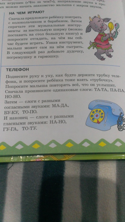 Телефон. Вы имитируете телефон, говорите два слога (па-ма, да-та, ма-мо и пр.). Ребенок должен эти слоги в точности повторять. Еве очень понравилась эта игра. Правда, мы модифицировали ее. Я шептала громко на ушко ей слоги, а она озвучивала. Необязательно это делать с Альбомом. Можно где угодно заниматься: дома, на улице, в машине. До сих пор играем. Думаю, эта игра позволила дочке расслабить язык. (Пардон за телефоно-фото)