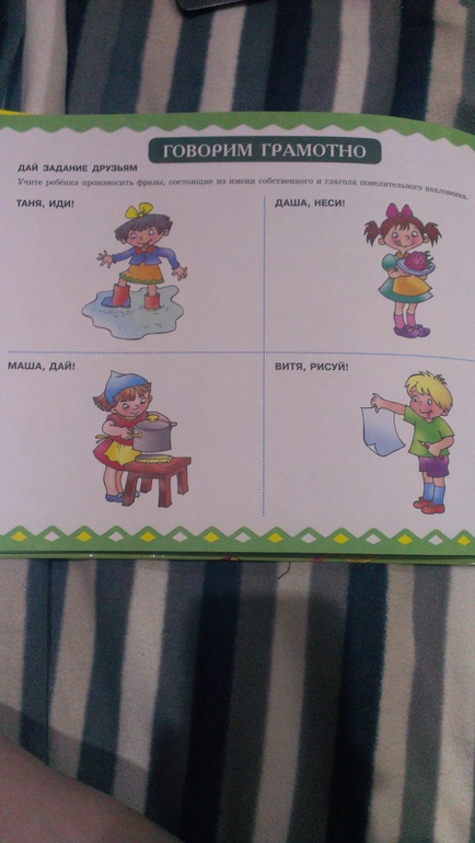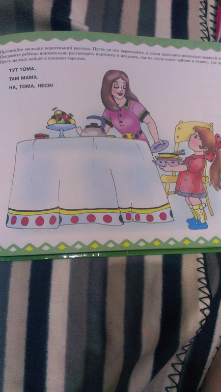 Здесь картинки и простые фразы. Таня, иди. Даша, неси. Еве тоже очень нравилось наказывать, кому что делать.