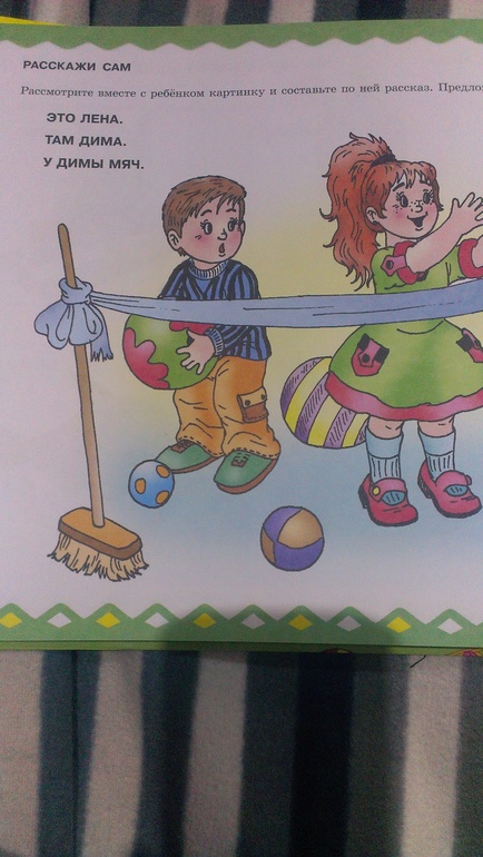 Здесь же мы учим ребенка падежам. "Нет кого?" "Нет мишки". Чем девочка нарисовала? Что нарисовал мальчик? И прочее.
