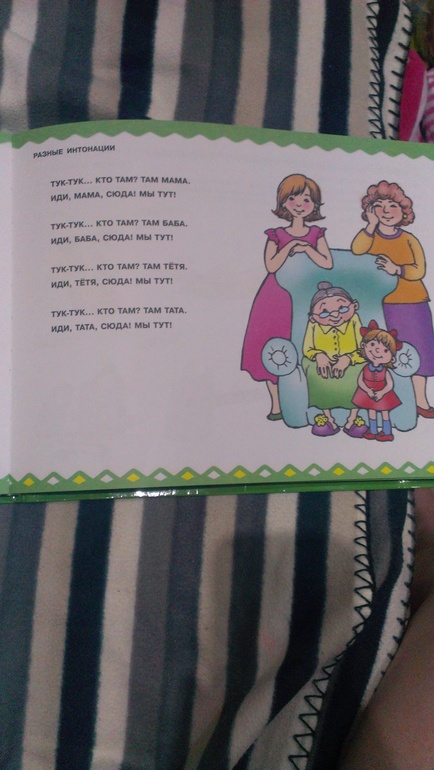 Ева сначала вставляла только "мы тут!" с восторгом. Постепенно начала дополнять мой рассказ своими репликами. Тук-тук. Кто там. Там мама.