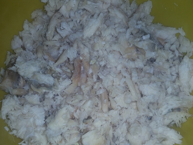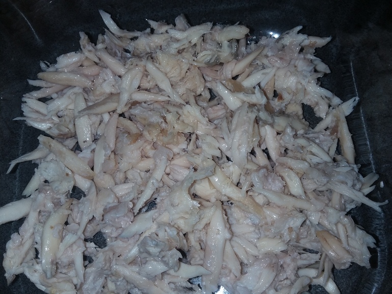 Разобранную на волокна копченую рыбу (у меня треска):