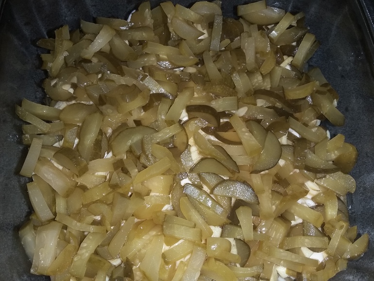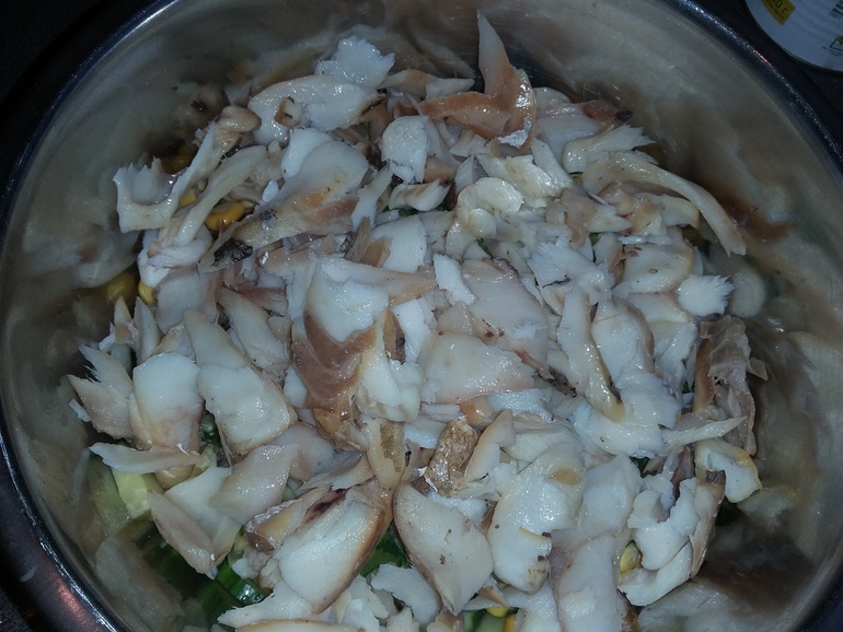 Положить разобранную на волокна рыбку: