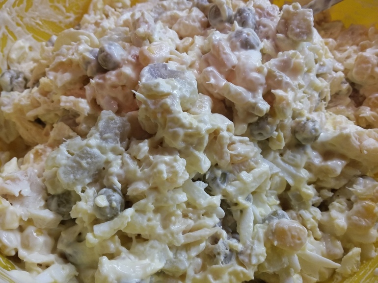 Перемешать. Заправить по желанию сметаной (тогда присолить еще) или майонезом: