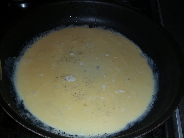 Разбить веселкой 2 яйца с солью и испечь тонкие блинчики на растительном масле: