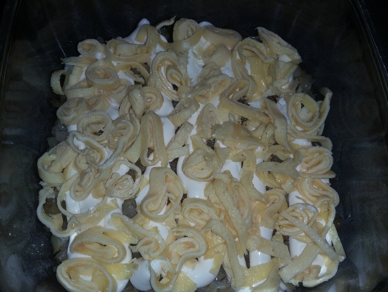 Слой майонеза. Нарезать яичный рулетик колечками, разложить на луке:
