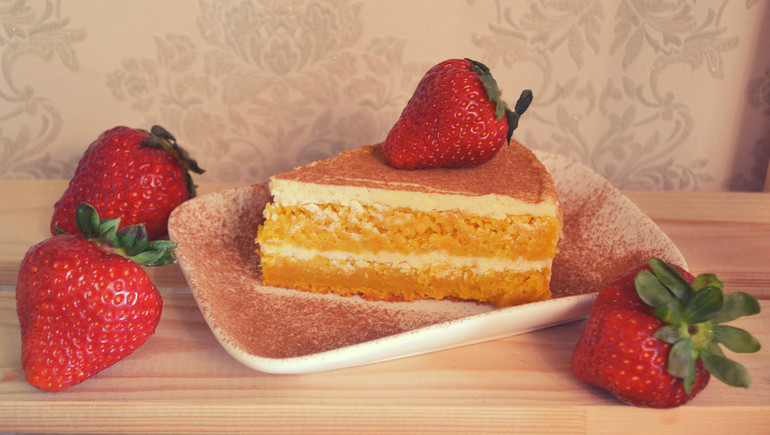 Любимый тортик всей семьи! Сочные морковные коржи отлично сочетаются с кремом из крем-чиза (творожный сливочный сыр, типа "Альметте" + слив. масло + сливки 33%+ сахар). Украшены корицей и клубничкой для пикантности!!! P/S можно добавить грецкие орешки в тесто!!!