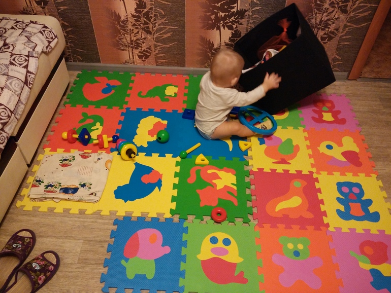 Так давно читала и слышала комментарии о том, что надо спускать ребенка на пол, но у нас первый этаж и пол холодный очень. огромных одеял нет. Мы купили мягкий пол, дождались отопления и вуаля! Алешка сразу встал на четвереньки. Ну это конечно уже не сильно важно, ибо он и на ножки с опорой встает и даже ходит немного за ручки😊 Потом купили ему новую игрушку говорящую и она ему понравилась. Игрушка от чикко, учит фразам, песенкам как на русском, так и на английском. Сводили его в контактный зоопарк)))) Я не видела как он там с бабой и дедом развлекался, но мне сказали , что ему понравились рыбы и циплята. Ну последнее....Мы взяли в аренду прыгунки!!!!!!!!!!!!!ура!!!!!!! Освободились мои ручки! Алешка в восторге)))
