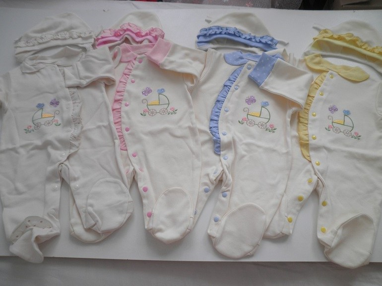 Комплекты на малышек комбинезон+чепчик с рюшем. Цвет молочный, розовый, синий, жёлтый. Размеры 56, 62. Интерлок (100% хлопок)