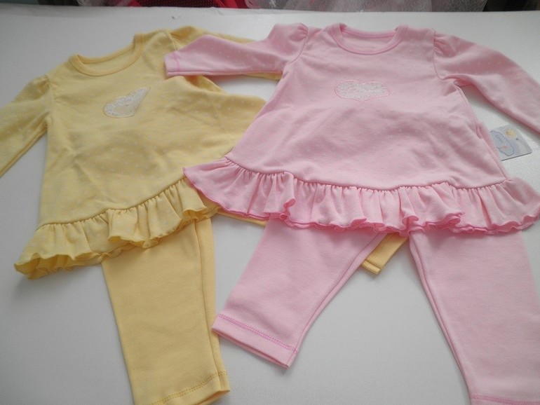 купить Комплект "Сердечко" Комплект для девочки состоит из туники и лосин. Есть в розовом и желтом цветах. Туника в белый горох, лосины - однотонные. Р-ры 74, 80 и 86. Ткань - интерлок. По нижнему краю туникик идет рюш. Туника украшена гипюровым сердечком со стразиками. Рукав длинный