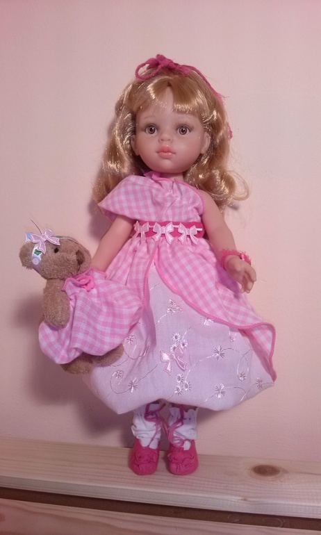Очень интересно, играют ли ваши девочки в куклы? Моя Маша играет только плюшевым медведем и немного волком икеевским, эти игрушки - друзья (по росту подходят). Но мне так хочется, чтобы она обратила внимание на куклы! Увидела я вот такую красавицу и влюбилась. Это Paola Reina Даша. На ней платье Hand made. У нас в Питере продаются эти куколки в Перинных рядах.