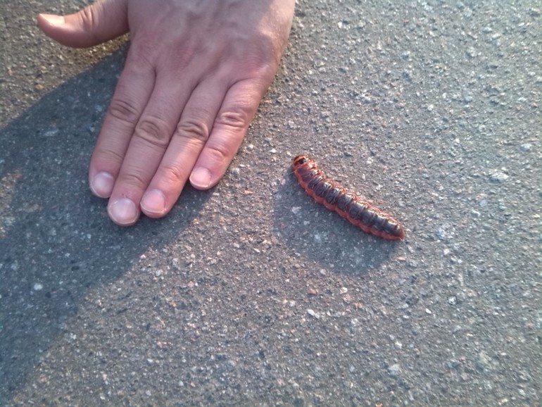 Вот какую гусеницу встретили мы в Питере. Это рука мужа, чтобы вы представляли ее размер. Мы уже второй раз подобную встречаем. Как вы думаете откуда она сбежала?