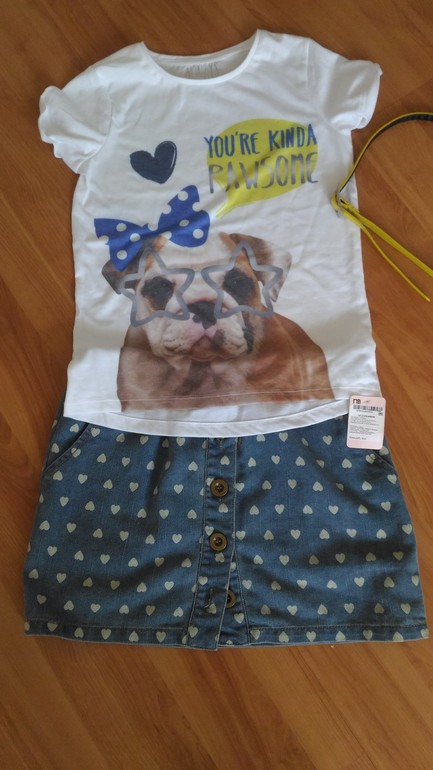 1.Комплектом Next,Mothercare.Комплект из юбки,футболки,джинсовой куртки и колгот.В идеале,футболка новая с этикеткой.Рост 140. Цена 1500