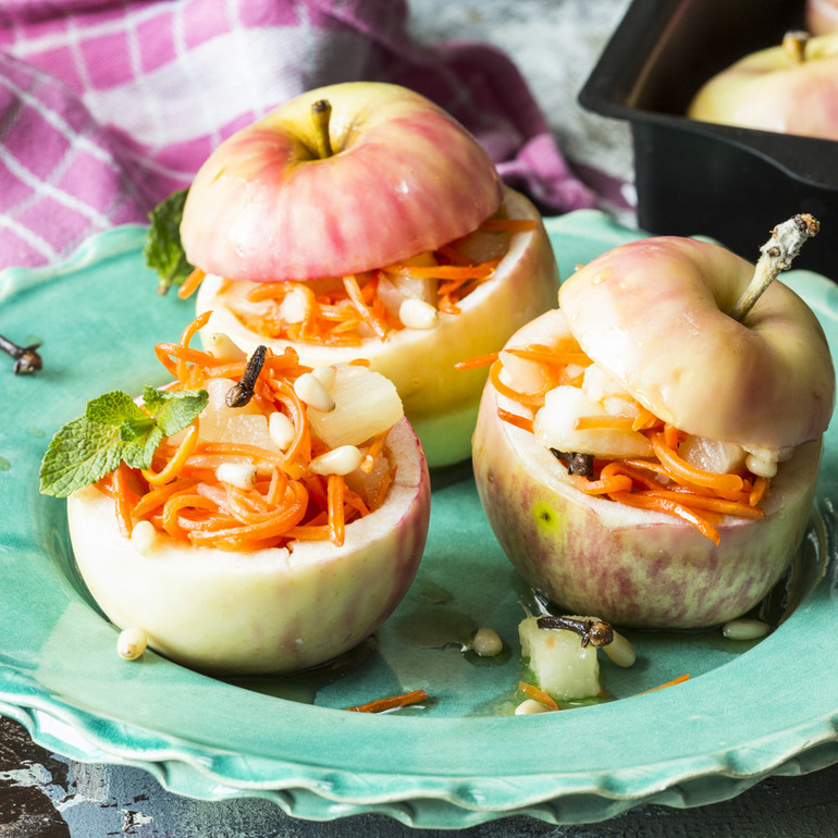 - Нафаршируйте яблоко смесью, накройте верхушкой. Запекайте в духовом шкафу при температуре 180 °C 10 минут.
