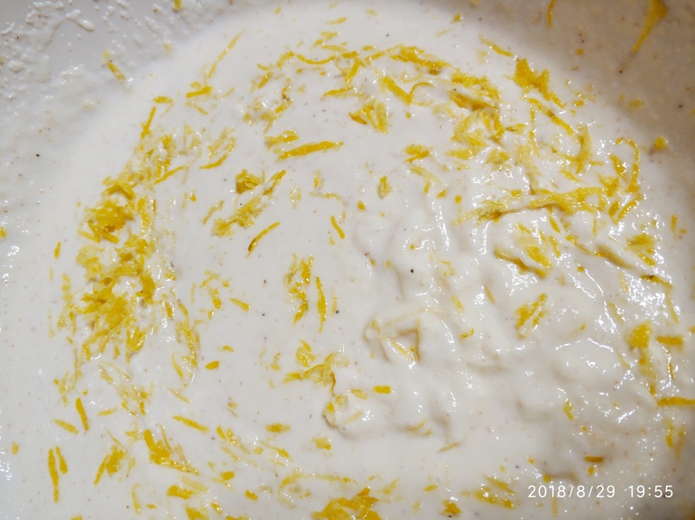 1 стакан кефира,1 стакан,муки,1 стакан сахара,1 стакан манки,3 яйца, пакетик ванилина,пакетик разрыхлителя,1 стакан подсолнечного масла,( я брала половину стакана),цедра апельсина.