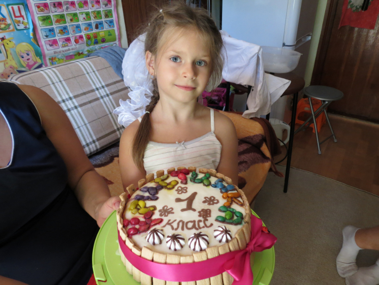 Первого сентября мы ездили торжественно провести нашу крестницу и Темчика троюродную сестричку Кристинку в первый класс ( испекли ей тортик).