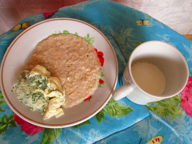 1. Овсяная каша (1 чашка молока, 1 чашка воды, 1 чашка овсяных хлопьев долгой варки, соль, сахар, слив.масло)
