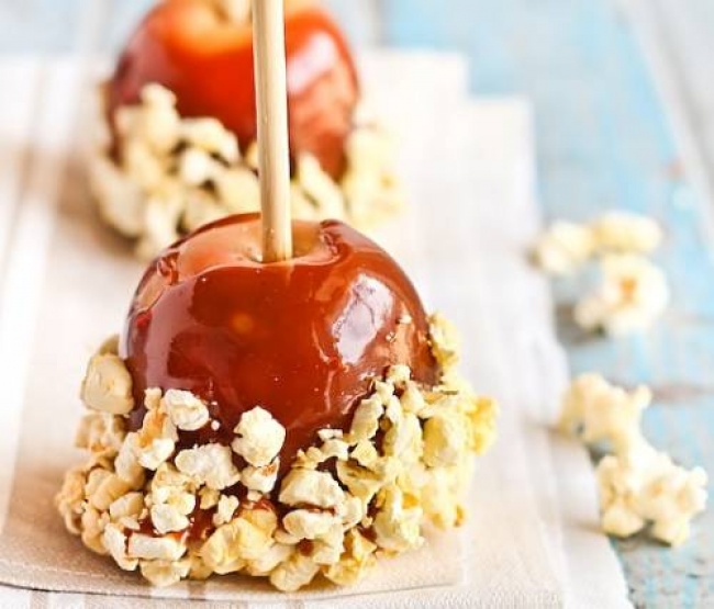 Окунаем каждое яблоко в приготовленный сироп, а затем панируем в слегка раскрошенном попкорне. Теперь выкладываем яблоки на тарелку, застеленную пищевой пленкой так, чтобы карамель не липла к пленке.
