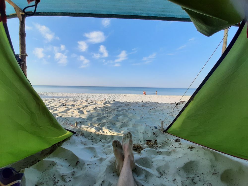 В этот раз просто арендовали палатку в кемпинге. С трехразовым питанием. С одной стороны острова залив, с другой море. Все чистое. Песочек.